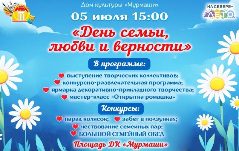 5 июля в 15:00 на площади Дома культуры "Мурмаши" состоится праздник "День семьи, любви и верности".