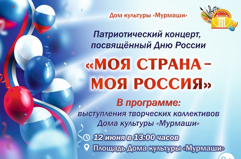 12 июня в 13:00 Дом культуры "Мурмаши" приглашает Вас на Патриотический концерт, посвящённый Дню России "Моя Страна – Моя Россия".