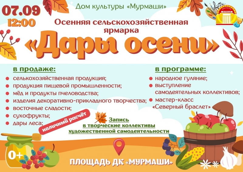 07 сентября с 12:00 на площади Дома культуры "Мурмаши" состоится традиционная осенняя сельскохозяйственная ярмарка "Дары осени".