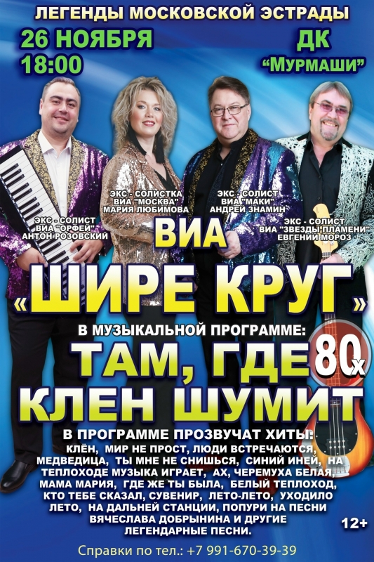 26 ноября в 18:00 Дом культуры «Мурмаши» приглашает на эстрадный концерт московского коллектива ВИА «Шире круг» с музыкальной программой «Там, где клён шумит»