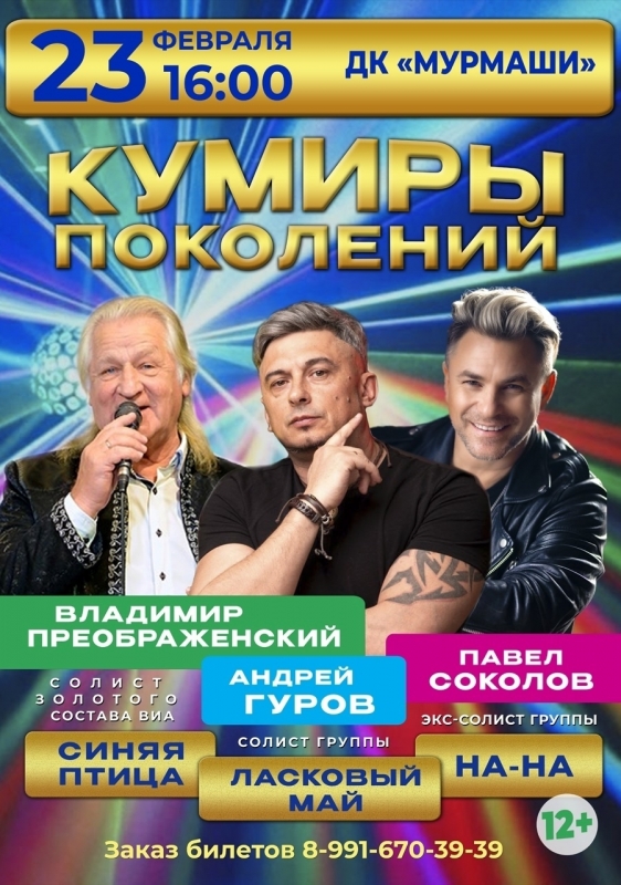 23 февраля в 16:00 в Доме культуры «Мурмаши» состоится концерт «Кумиры поколений», который подарит всем присутствующим настоящую машину времени. Зрители окунуться в атмосферу любимых мелодий, которые знает и любит не одно поколение.
