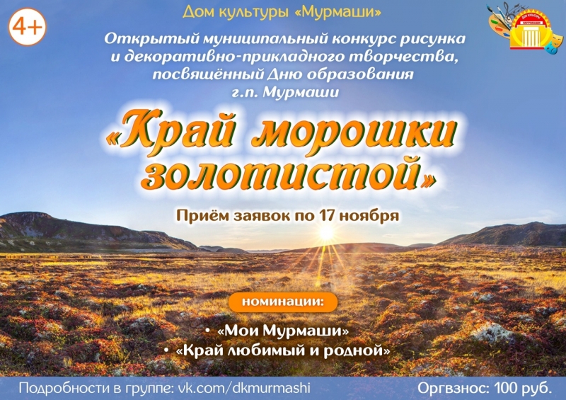 Мы объявляем о начале открытого муниципального конкурса рисунка и декоративно-прикладного творчества «Край морошки золотистой». Творческое состязание посвящено 87-летию со дня образования городского поселения Мурмаши.