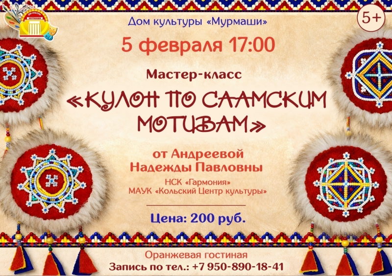 5 февраля в 17:00 Дом культуры «Мурмаши» открывает двери для всех, кто любит творить! Приглашаем вас на увлекательный мастер-класс «Кулон по саамским мотивам».