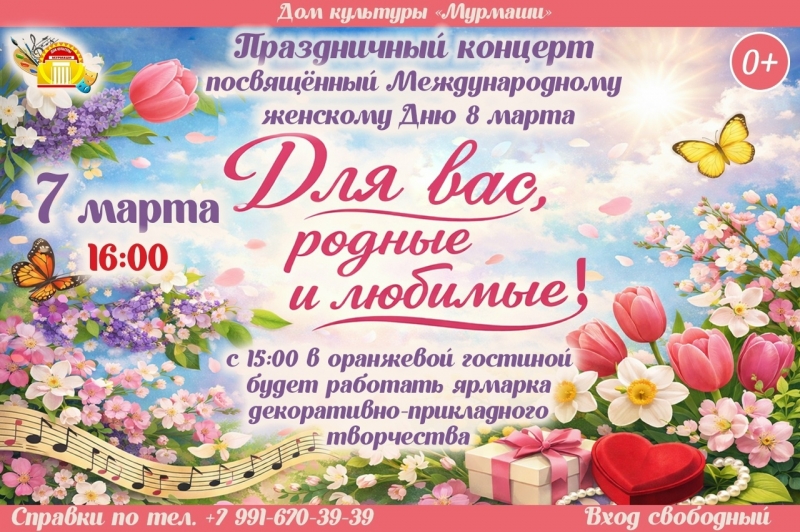 7 марта в 16:00 в Доме культуры «Мурмаши» состоится Праздничный концерт «Для вас, родные и любимые», посвящённый Международному женскому дню 8 марта.