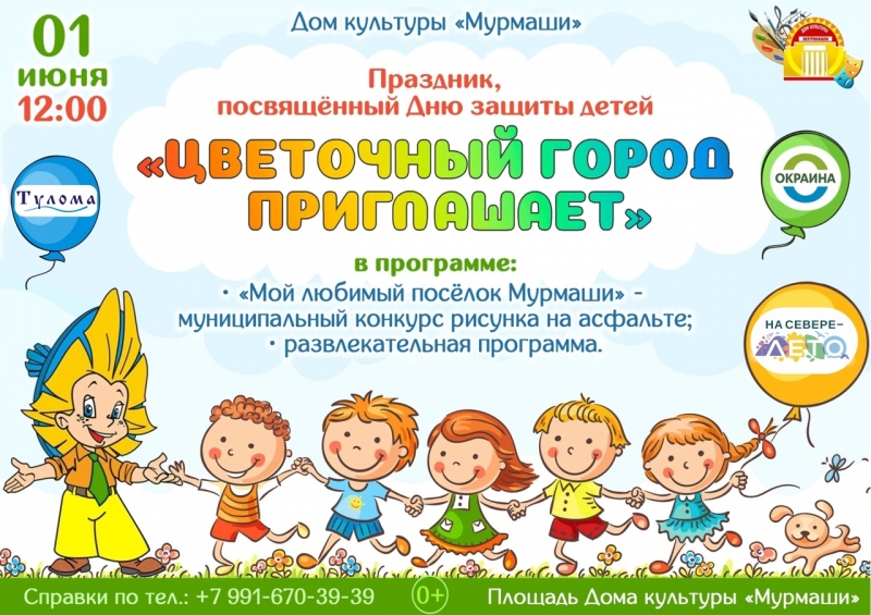 1 июня в 12:00 Дом культуры "Мурмаши" ждёт вас на праздник, посвящённый Дню защиты детей "Цветочный город приглашает".